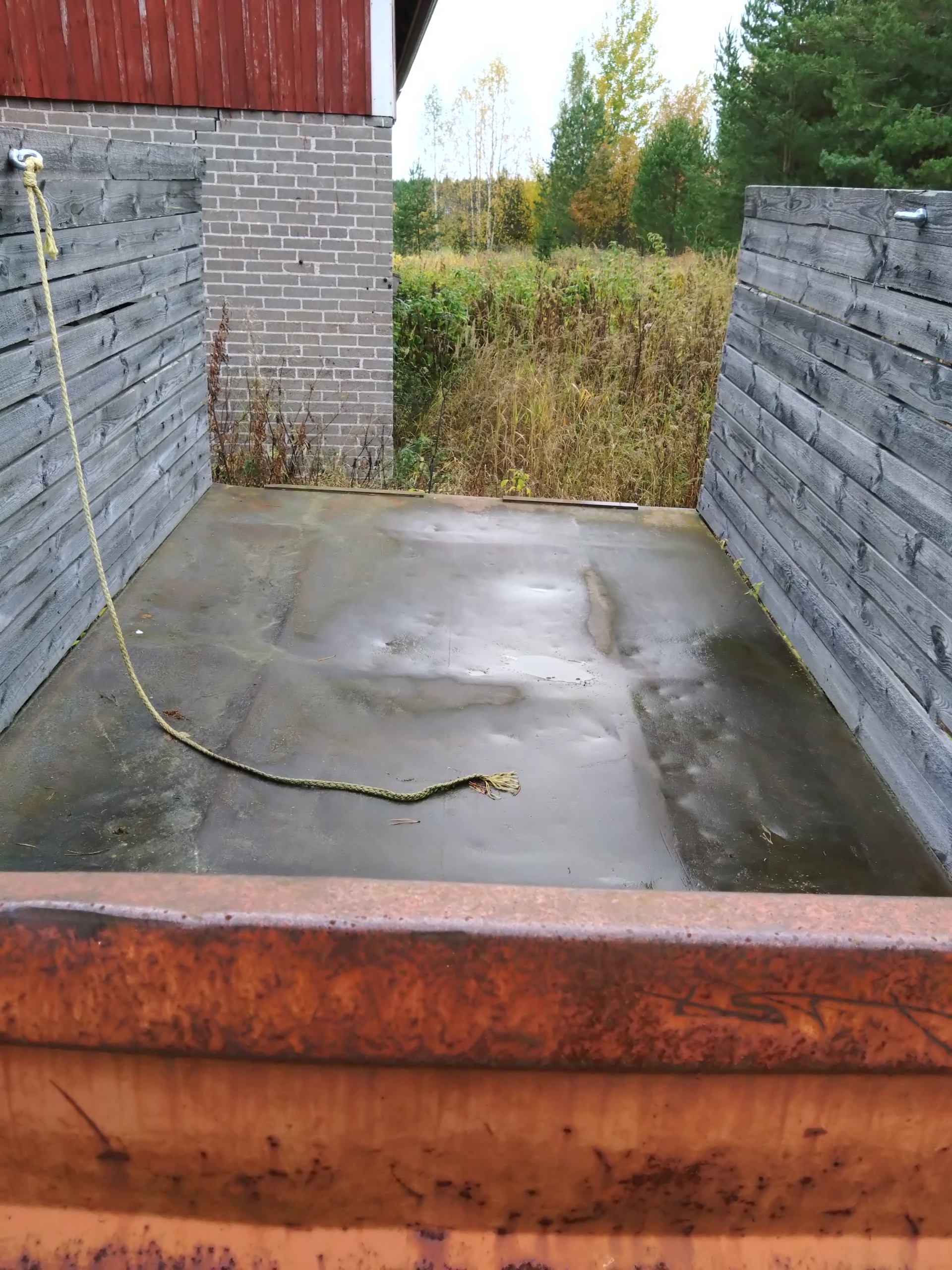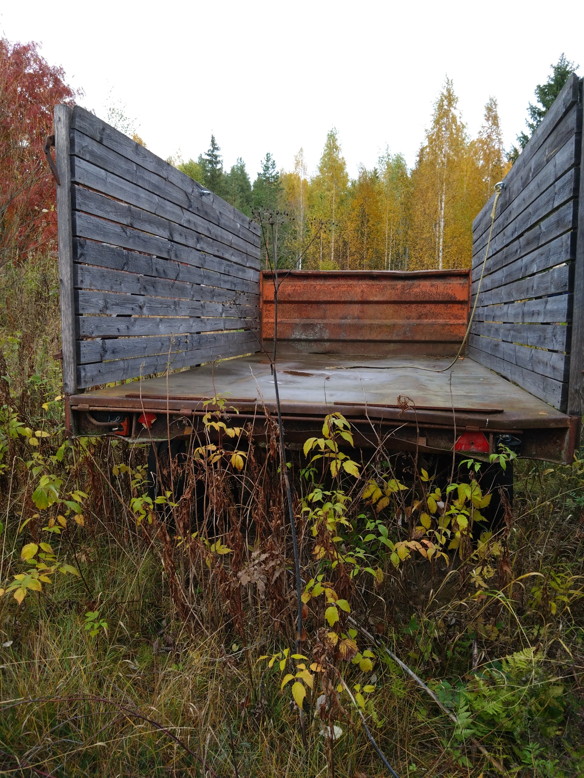 Puulaidat, ehyet renkaat, kippaa ja kukkuu. Valot rikki, se olikin vikatikki. Renkaat ok. Matala teräksinen takalaita löytyy myös, puisen lisäksi. Kärry Joroisissa, ostajan noudettava se sieltä.