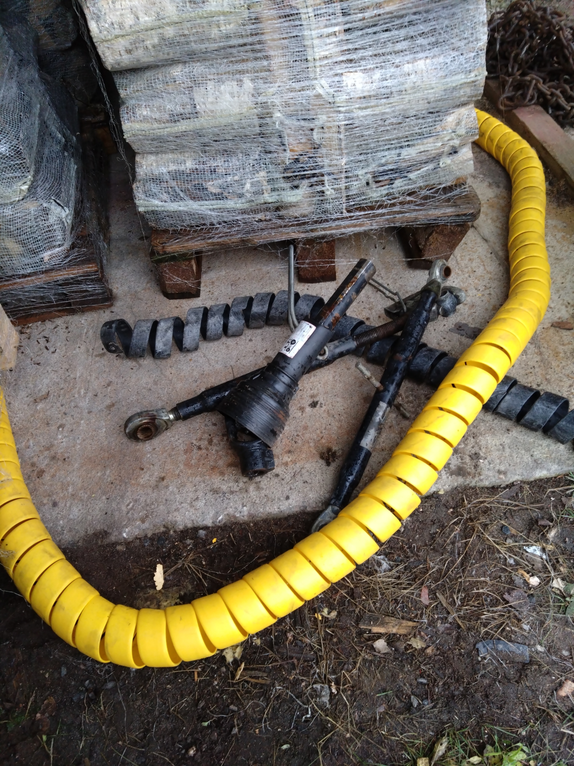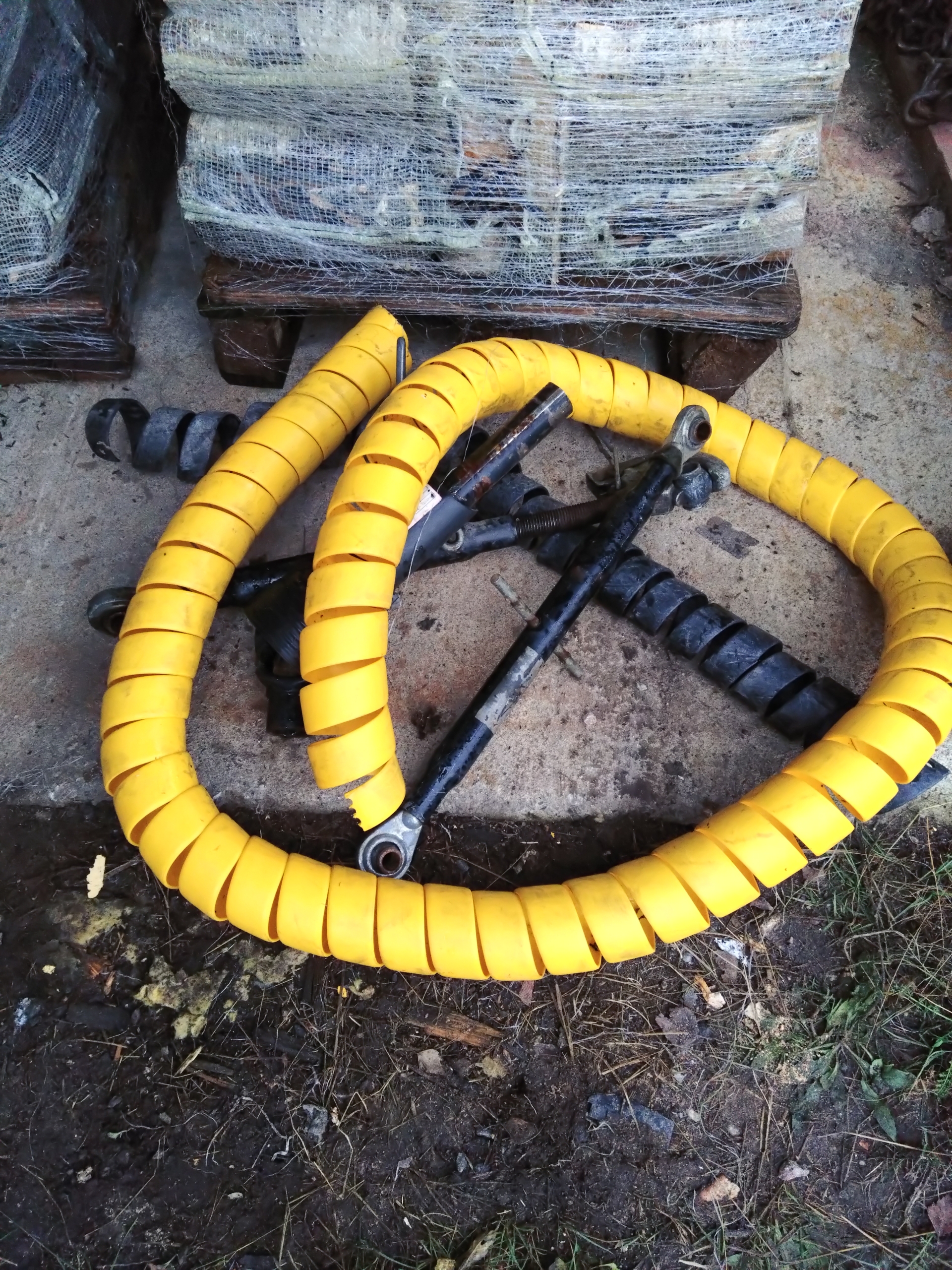 Useita metrejä keltaista letkun suojaa 100mm, 2 työntövartta ja yksi akselin tumppi ja yksi paskapätkä mustaa letkun suojaa.
