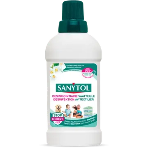 Matalassa lämpötilassa pestyihin vaatteisiin voi jäädä bakteereja, hiivoja ja viruksia, jotka voivat levittää sairauksia ja aiheuttaa pahaa hajua. Valkaisuaineettoman desinfioinnin asiantuntija SANYTOL on kehittänyt vaatteita varten desinfiointiaineen, joka poistaa mikrobit 20 °C:n lämpötilasta alkaen. Sen ainutlaatuinen, dermatologisesti testattu koostumus poistaa tehokkaasti bakteerien aiheuttaman pahan hajun. valko- ja kirjopyykistä kuituja rikkomatta. Vaatteesi ovat puhtaita ja puhdistettuja. Testattu tekstiileillä, jotka on pesty tuotteella käyttöohjeen mukaisesti.