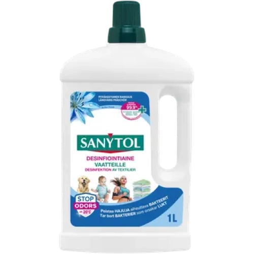 Sanytol eliminoi kolmitehoisen vaikutuksensa ansiosta bakteerit, hiivat ja virukset poistaen pahojen hajujen aiheuttajat. Tehokas myös alhaisissa lämpötiloissa ja lyhyillä pesuohjelmilla. Ilman klooria.