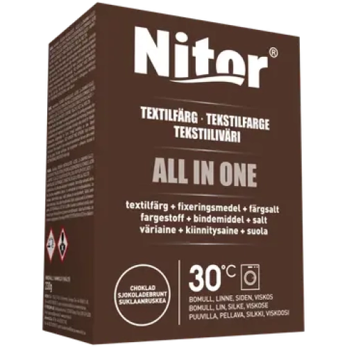 Soveltuu seuraavien kankaiden värjäämiseen: puuvilla, pellava, silkki, viskoosi, juutti, Tencel, Lyocell ja Modal. Nitor All in one -tekstiiliväripakkaus sisältää kaiken tarvittavan: väriaineen + kiinnitysaineen + suolan. 1 pakkaus Nitor All in one -tekstiiliväriä riittää värjäämään 200-600 g kuivaa tekstiiliä. Uudistettu - ei sisällä fosfaatteja.