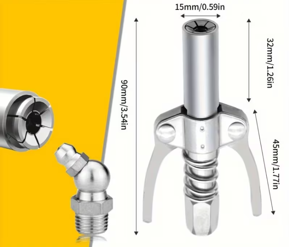 - Universaali yhteensopivuus: Sopii kaikkiin vakiomallisiin rasvanippoihin (M6/M8/M10/M12). Voidaan käyttää manuaalisten, pneumaattisten (paineilma) ja akkukäyttöisten rasvaprässien kanssa.