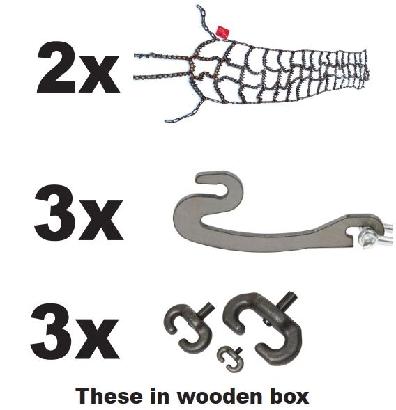 - Valmis Käyttöön: Ketjut toimitetaan pareittain ja sisältävät kaikki tarvittavat lenkit ja kiristimet.